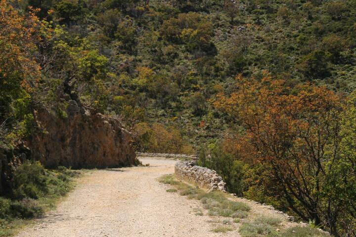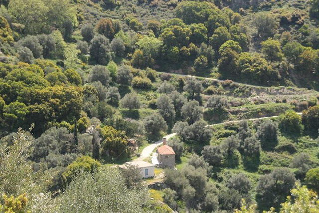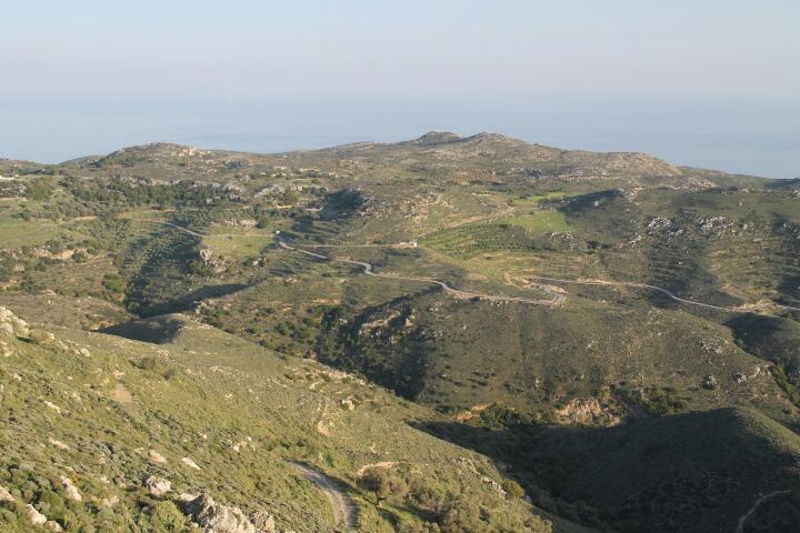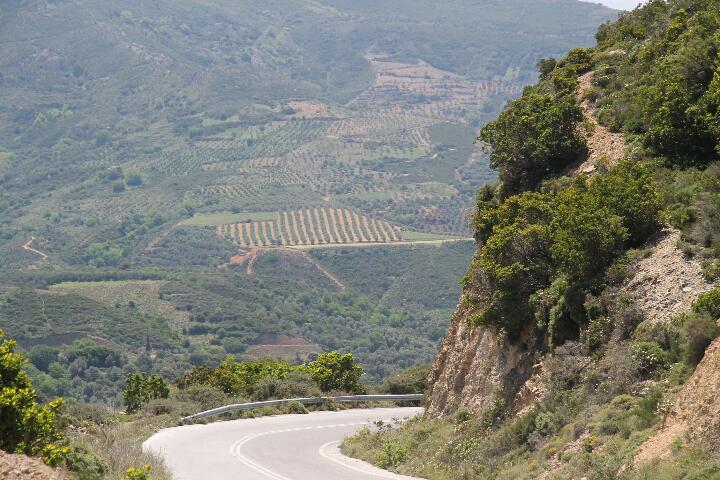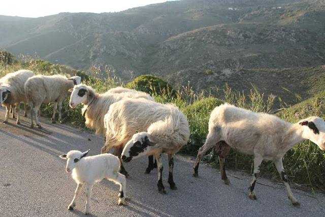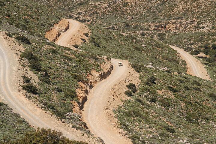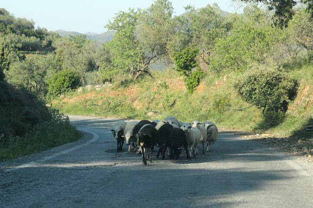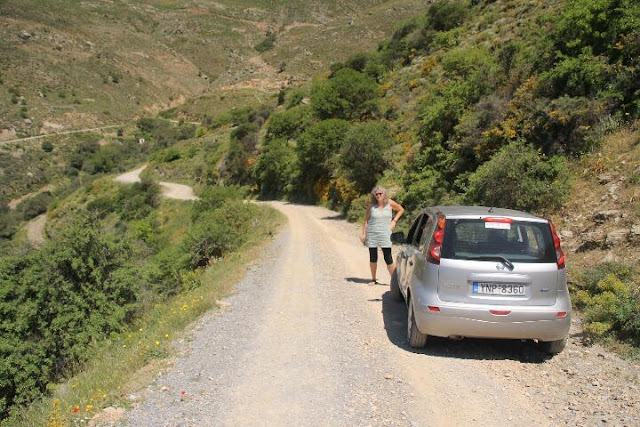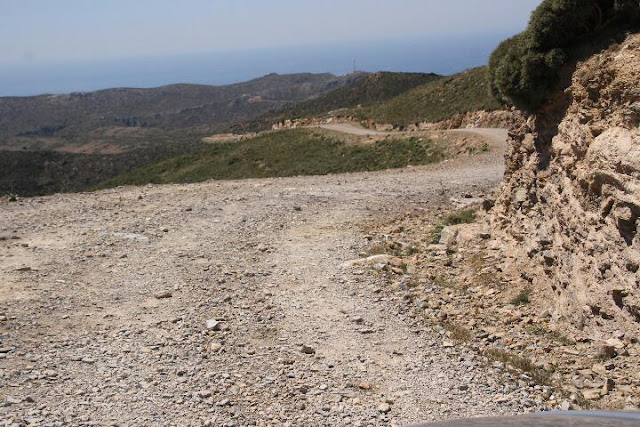 Crete is large enough to have a substantial mountainous interior, and we've spent a couple of days just driving wherever our wheels will take us, from the highest plateau under the high peaks to gorgeous voices at the bottom of gorges. Every destination involves driving up a gorge, crossing a high pass, and usually doing it again and again. Luckily most of the roads are paved and in remarkable shape for a bankrupt country, but they still twist and turn with endless hairpin curves. The smaller roads have no guardrails, and in places the edges have crumbled, so it's not for the faint of heart. A few times we chose or were forced onto very narrow dirt roads with loose rock and potholes almost worthy of Africa or Costa Rica, teetering on the brink. But the experiences have always made it worthwhile, with picture-perfect villages set in dizzying terraced mountainsides, lush gorges, barren craggy peaks, and a feeling of total safety (aside from our driving...) compared to the slight edge we sometimes were on earlier in these adventures.